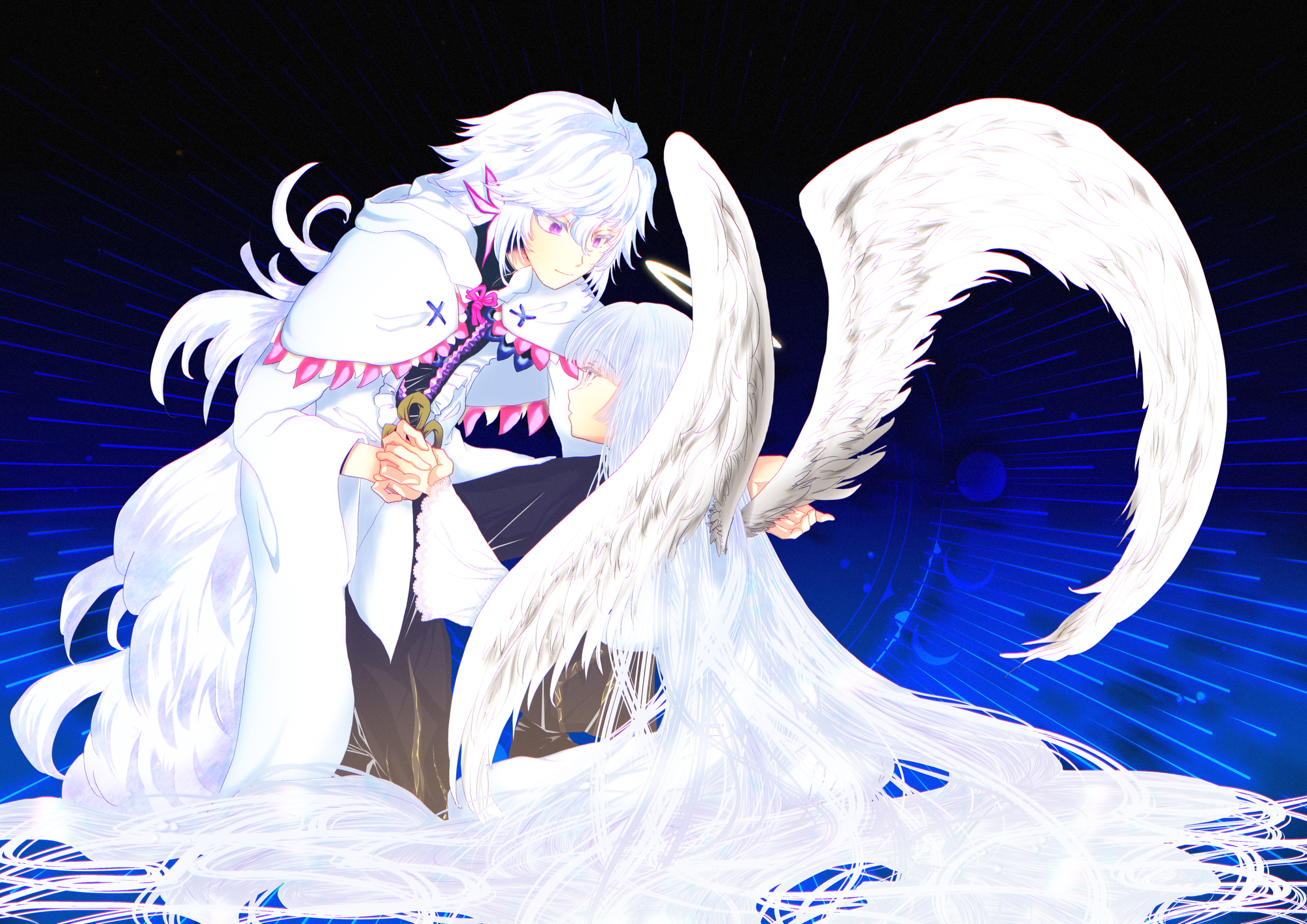 10月4日は天使の日……ということで天使が描きたくて描いた絵。珍しく銀髪の方。最近色塗りが楽しいのはいいんですが、背景をどうしたらいいのかアイディアも知識も無いのが致命的。マーリンが片手を羽根に添えているのは、支えているのではなく飛べなくなるようにしようと画策しているのを匂わせたつもりでした。