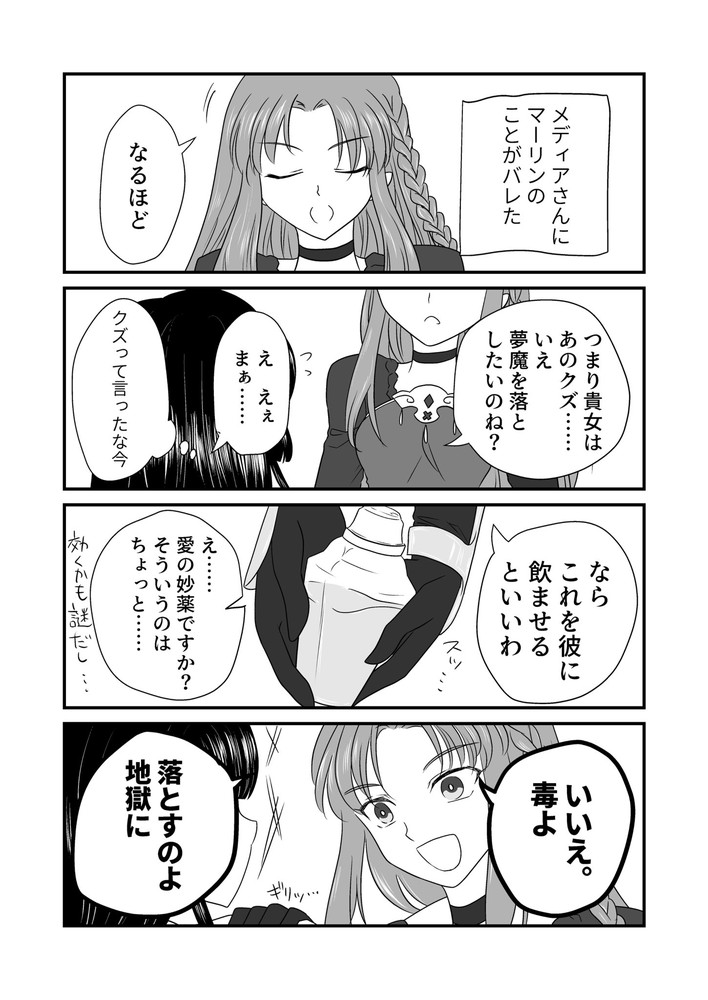 マーリンが出てこないマーリン夢漫画(?)です。メディアさんはマスターのことを愛弟子として可愛がっています(が、現在はエルメロイ二世が魔術を教えているので実際は元弟子)※描き直したので新しい方を上げておきます。(旧作ももったいない気がしたので下に置いておきました(笑))