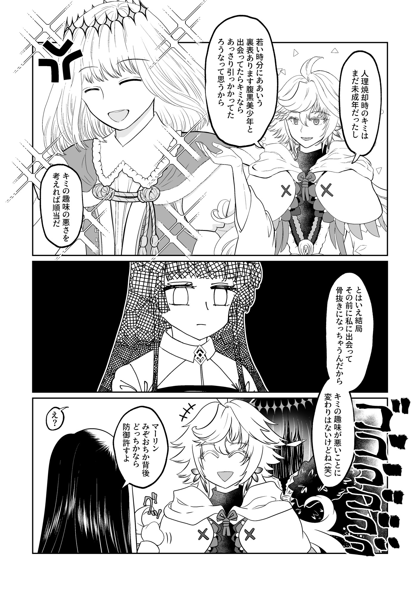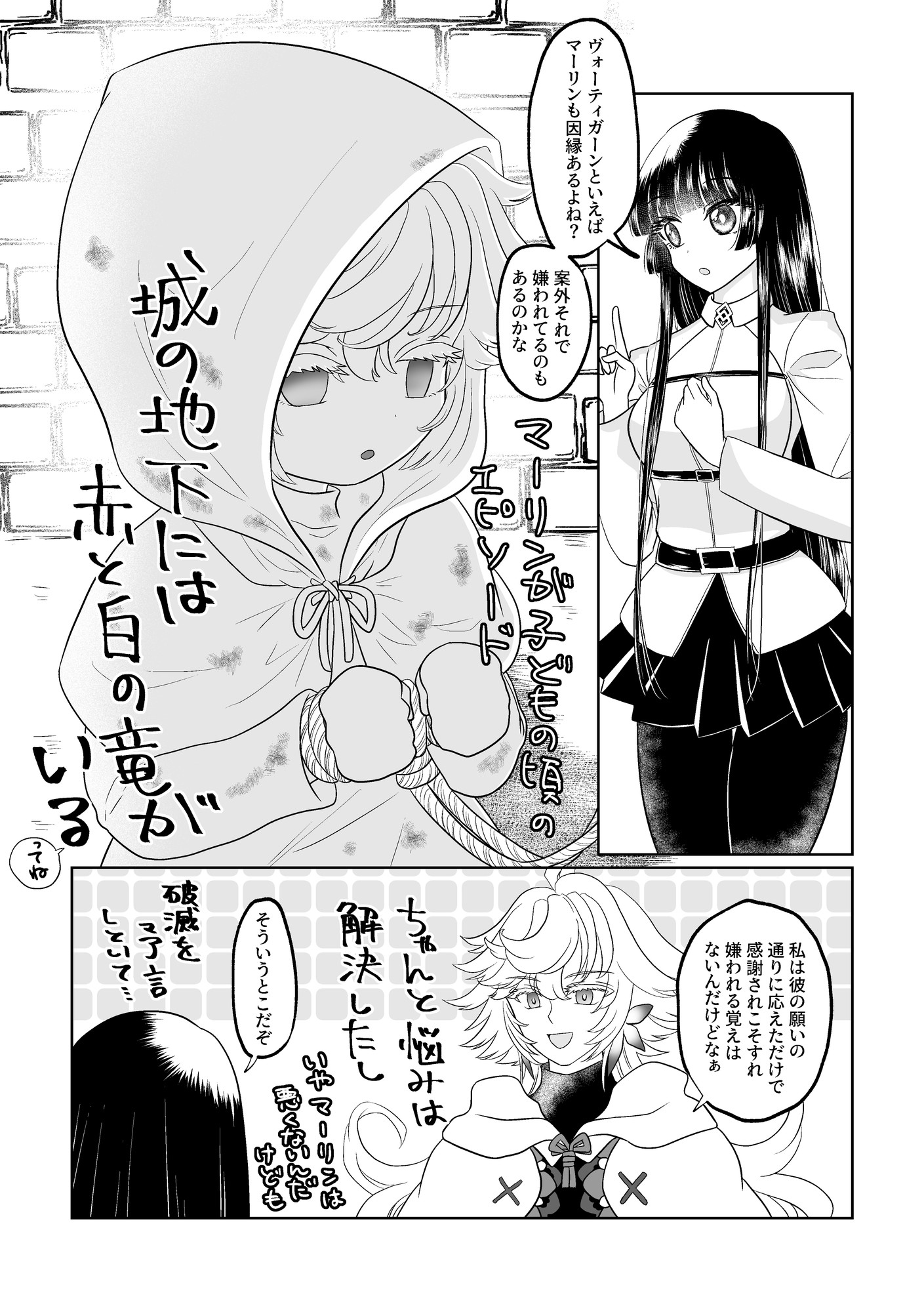 オベロンネタをいろいろ考えてた頃に描いたような気がするものの、妙に気恥ずかしくて完成させていなかったんですが、手持無沙汰だったので無心で描いてたら描き終わっちゃった。マーリンの発言はマーリンの感想であり私の代弁ではないということだけ主張しておきます(笑)※マーリンは黒いオベロン見たことないかもしれん(白い方は肉眼では見えてます)【23/8/2追記】後で気づいたけど思いっきりヴォーティガーンの方とマーリンが会話するネタを本の方で描いてた。