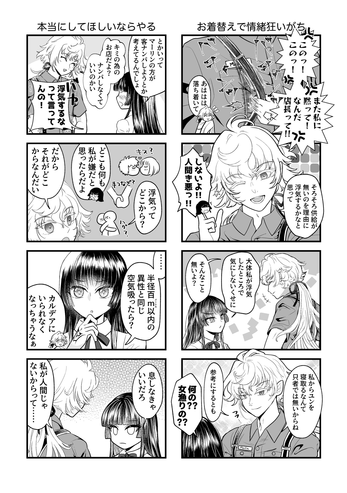 店長も描いときたかったけどあんまり関係なくなった店長マーリン漫画。本音を言うと肉体接触はそこまで気にしないけど「好きだよ」とか言ってたら嫌だなーって感じ。※同人誌用に4コマ書き足したので追加しておきました。マスターのメロメロさに絶対の自信があるマーリン。