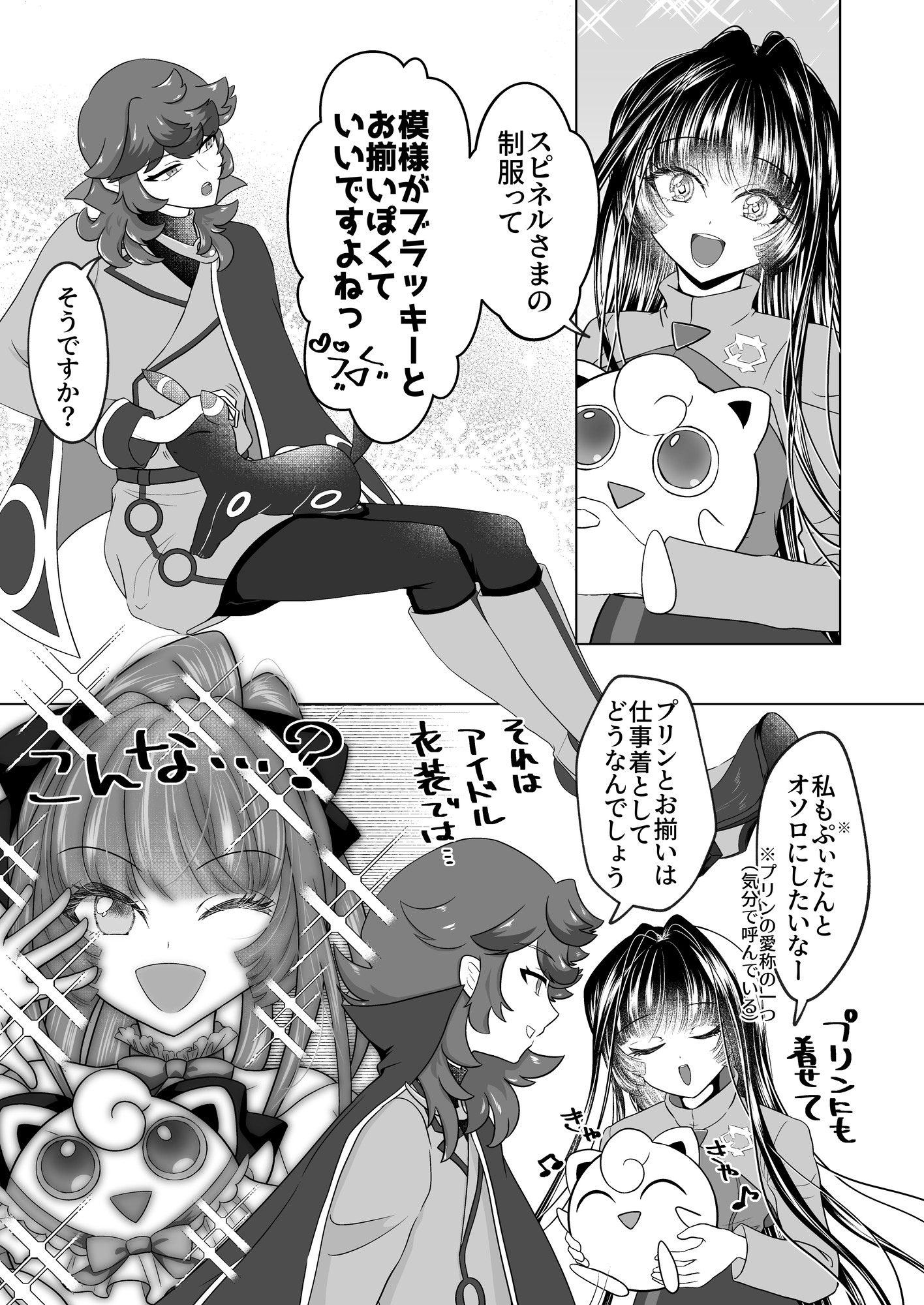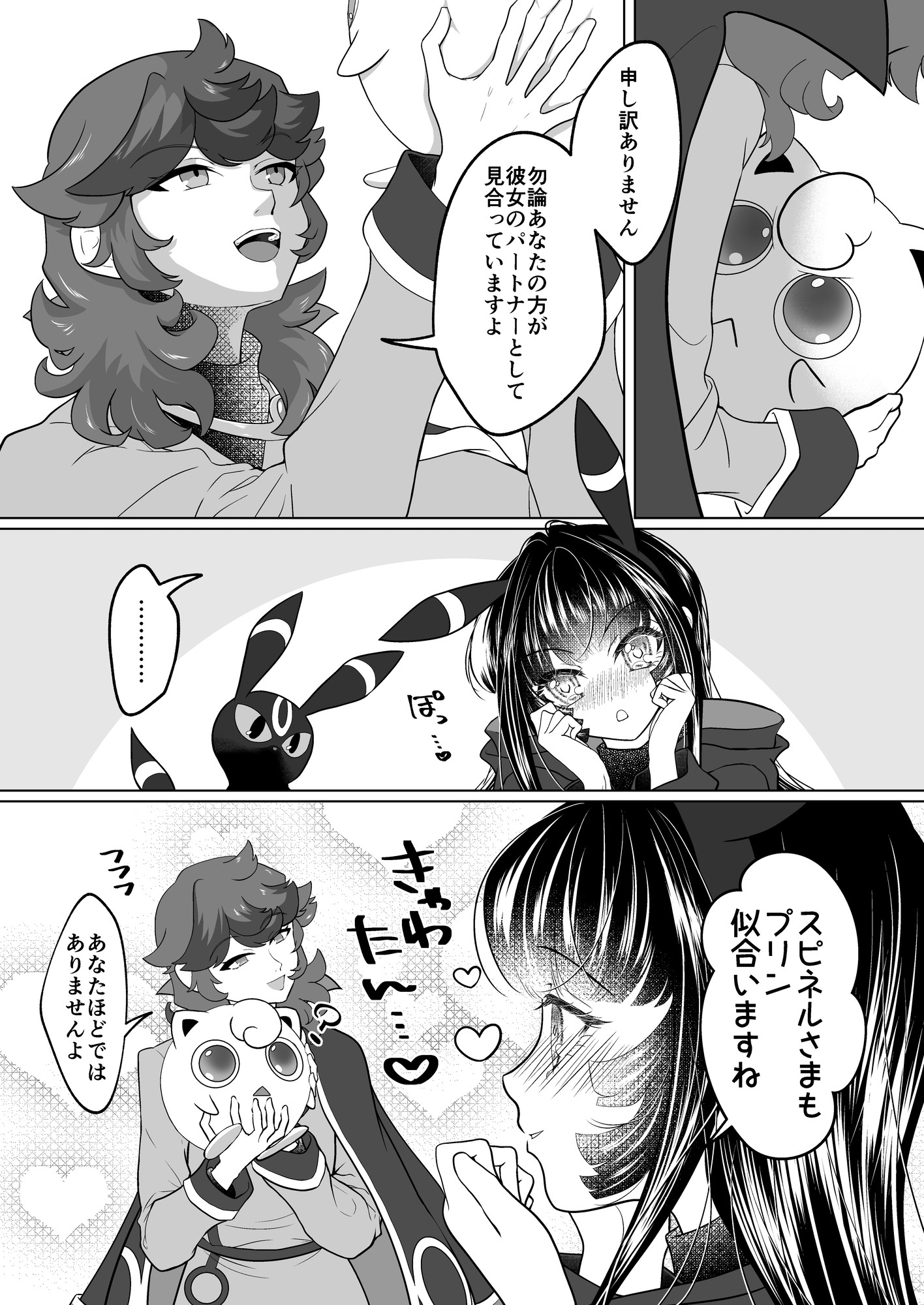 ポケモンのサイズ感わから~ん!!と思いながら描いた漫画。もっとデフォルメきかせた絵の方がそれっぽかったかな……スピネルさん身長いくつ……?いやいくつか分かったところでな。縮尺が難しい(笑)というわけで夢主はスピネルの部下です。相棒はプリン(私が好きだから)。アニメのストーリーが進行しないと確定しない設定が多くて、部下ってこと以外はふわっふわしています(私の中にはいろいろと設定が積みあがってはいるんですけど……)